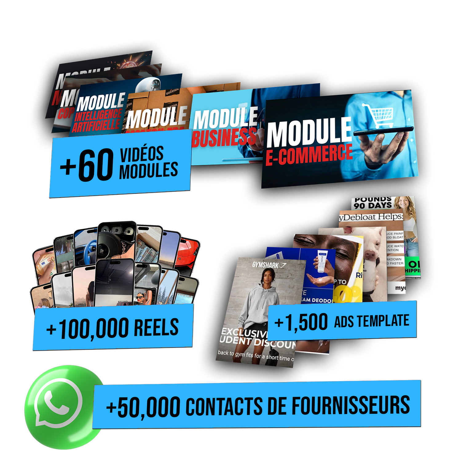Accède à tout le contenu du VIP E-BOOK PACK directement inclus dans ton ONLINE BOOTCAMP : un concentré de stratégies, contacts fournisseurs, templates, ressources exclusives et conseils pratiques pour booster ton business (e-commerce, Amazon FBA, freelancing et bien plus).